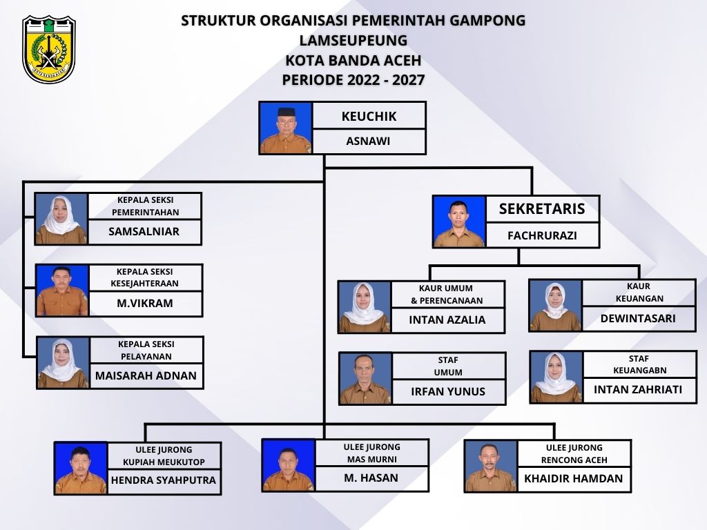 Kasi PemerintahanSamsal NiarMelaksanakan tata praja pemerintahan, menyusun rancangan regulasi Gampon, Pembinaan masalah Pertanahan pembinaan Ketentraman dan ketertiban pelaksanaan upaya perlindungan masyarakat, kependudukan, penataan dan pengeloalaan wilayah, serta pendataan dan pengelolaan profil Gampong.
